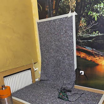 Täck över och mät. Börja med att mäta var borrstativets bultar ska sitta i förhållande till borrmaskinens position. Täck sedan golvet och eventuellt väggen väl; att borra dammar mycket!