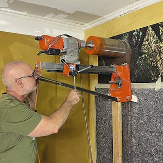 Det handlar om stora krafter: maskinen och stativet är tunga, och den kraftfulla borren ska kämpa sig igenom den hårda betongen med småsten i. Därför måste du bulta fast maskin och stativ i väggen.