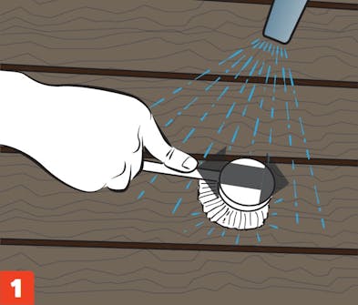 Tvätta träet noga med t.ex. målartvätt. Använd borste för att få bort smuts och alger. Skölj rent med vatten och lått träet torka över natten.