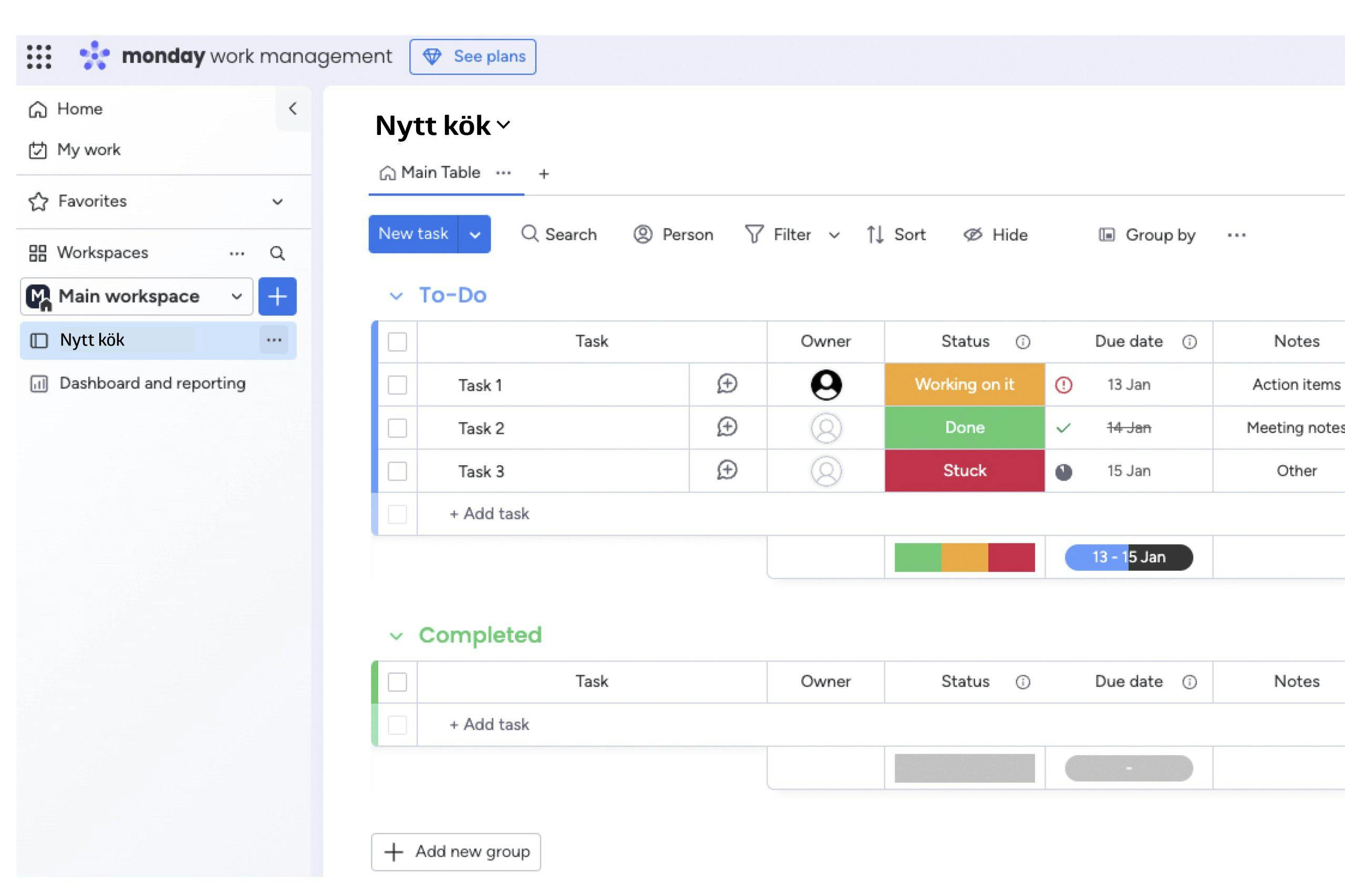 Vårt köksprojekt är byggt i gratisversionen av Monday. När du skapar ett konto får du alla funktioner och alternativ gratis i 14 dagar.