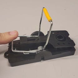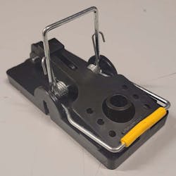 Det här är en variant av en klassisk musfälla som fungerar med hjälp av en fjäderbelastad bygel som hålls på plats av en tryckplatta när den är spänd. Betet läggs på tryckplattan, så att musen utlöser fällan när den sträcker sig efter betet. När fällan fungerar, avlivas musen av slaget från bygeln.
