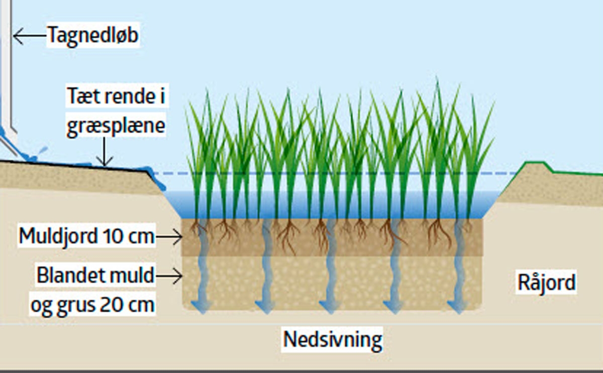 Regnrabatten tar hand om vattnet från stuprören och låter det långsamt rinna ner i marken – via rabatten. Det är klokt att dimensionera regnrabatten efter hur stort taket är.