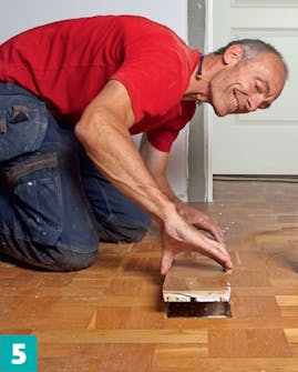 Limma kanterna på golvbiten, och placera den i hålet. Banka och tryck ned så att den hamnar i nivå med resten av golvet.