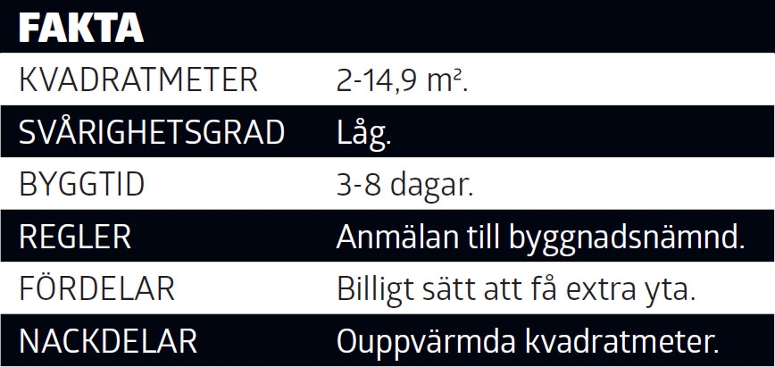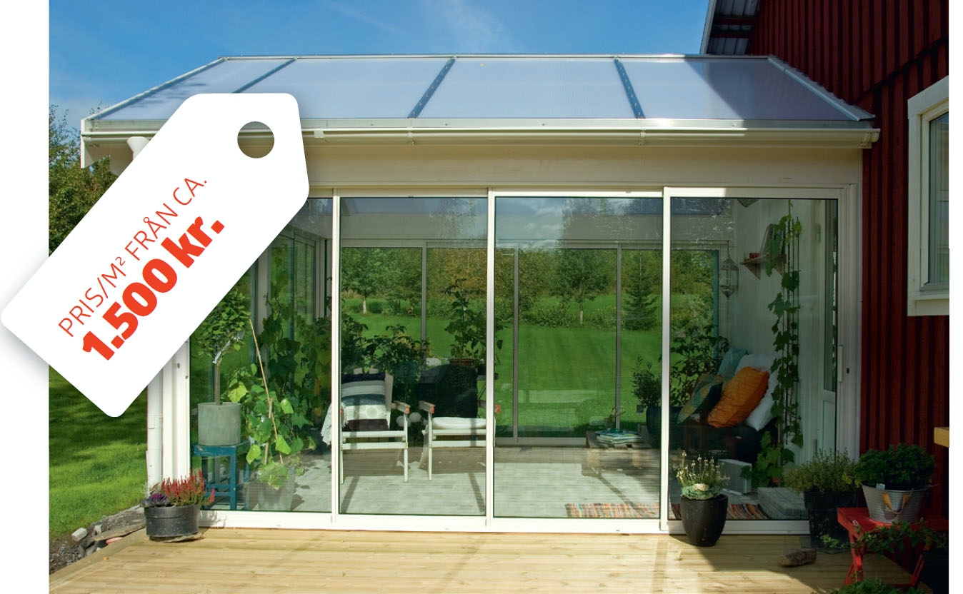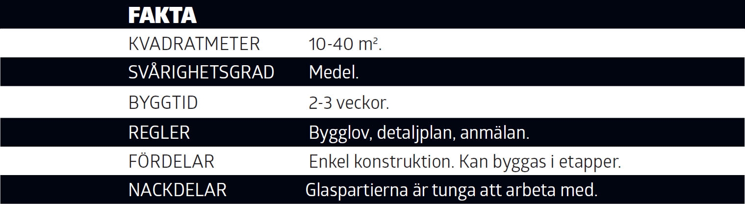 Uterummet förbättrar möjligheten att sitta utomhus under vår, sommar och höst. Och så kan en stor del av husets växter flytta ut i glasbyggnaden. Var dock uppmärksam på att uterummet räknas med i bebyggelseprocenten, och att du måste söka bygglov för projektet.