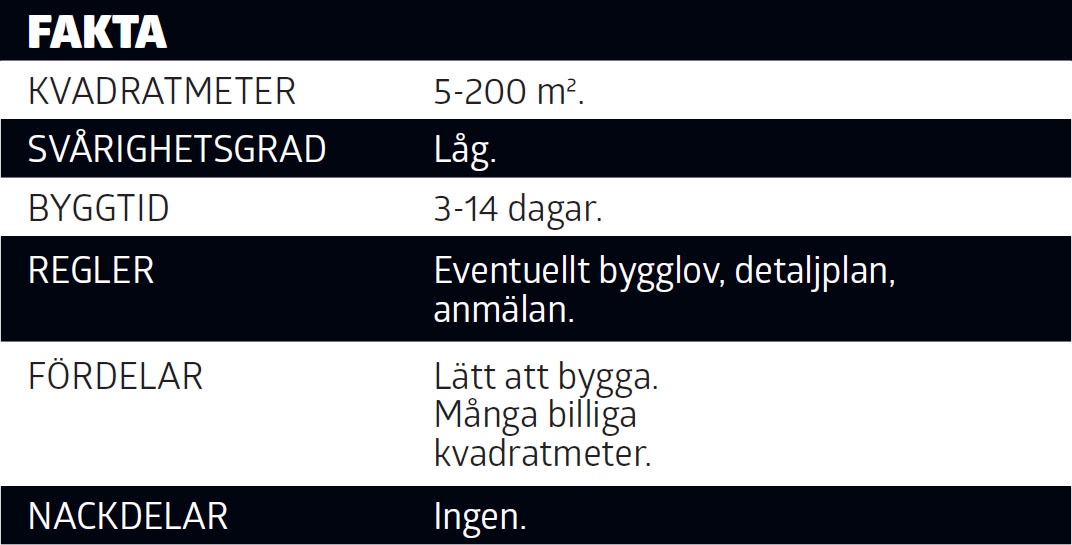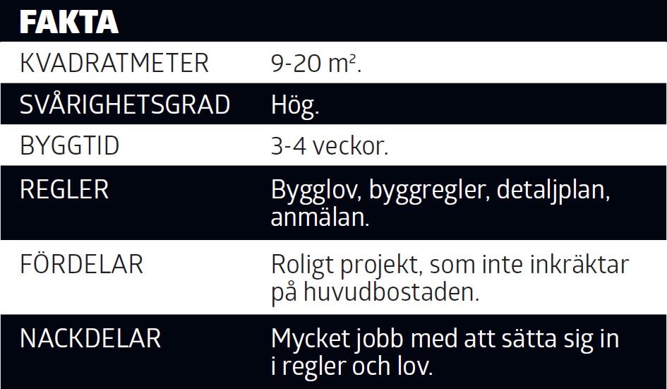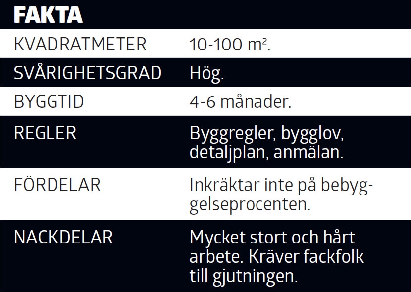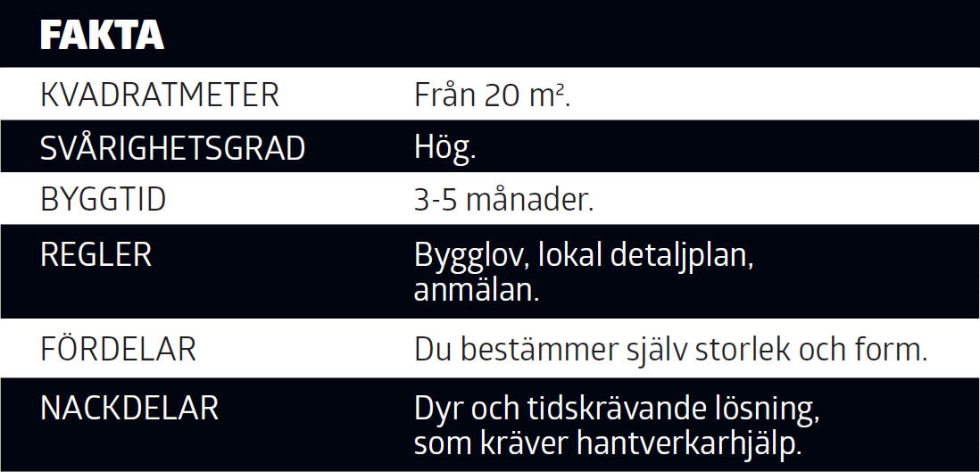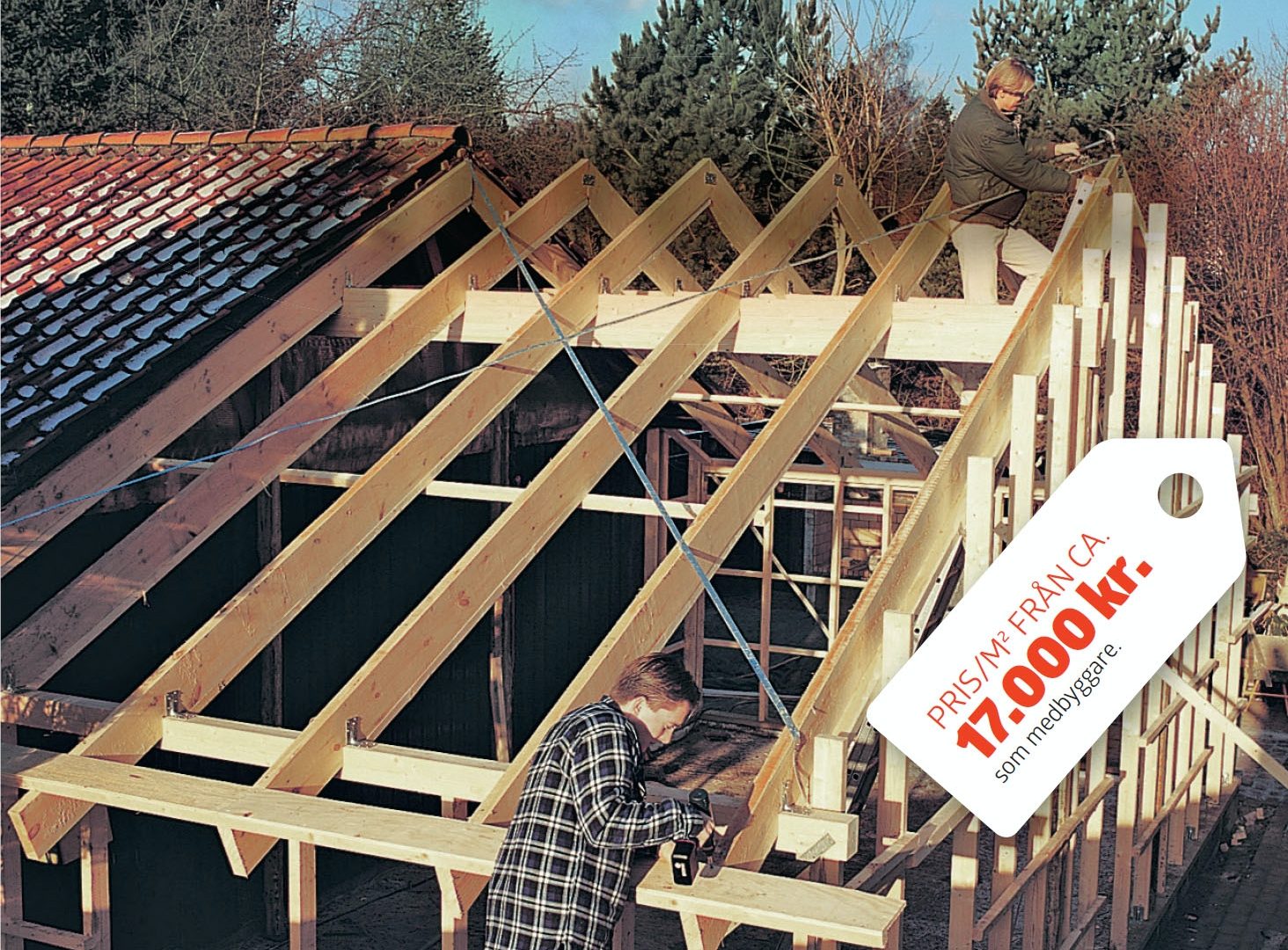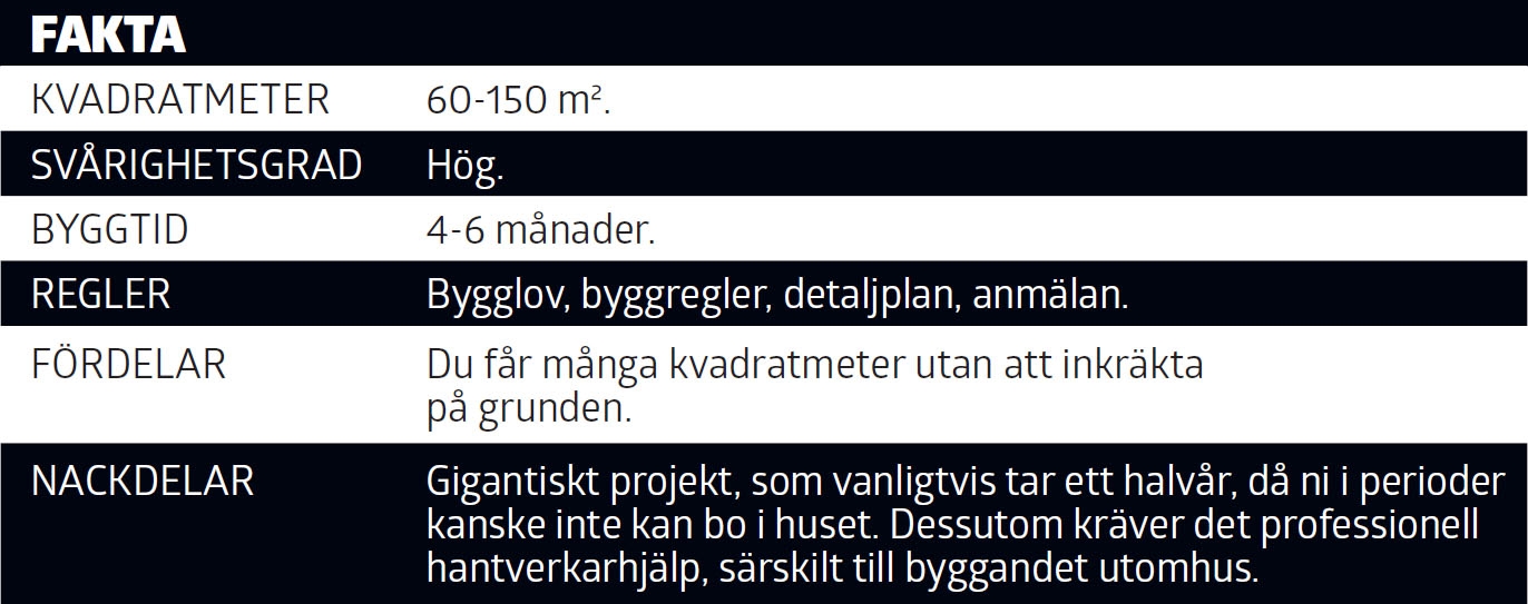 Det krävs fackfolk för att bygga taket och andra bärande konstruktioner, och även till de nya vatten- och elinstallationerna. Som erfaren gör det självare kan du själv stå för stora delar av det invändiga färdigställandet, som exempelvis isolering, ångspärr, beklädnad, golv och skiljeväggar.