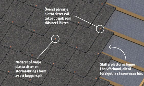 Andra raden skiffer ligger över tre läkt. Den är förskjuten i förhållande till första raden, så att plattorna ligger i halvförband (se ritningen). Spiken ska sitta i den mittersta läkten.