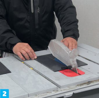 Vi sågar upp en bit ströläkt för varje takstol. Med en elhyvel gör vi snittet snett. Det kan också göras på en bordscirkelsåg. När första läkten har gjorts kan de andra mätas upp efter den.