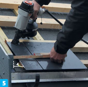 Varje skifferplatta ska ha två spik överst, 2-2,5 cm från kanterna så att de inte bryts av. Ute vid vindskivan håller vi 4 cm avstånd, så att den lilla “ränna” vi gör här senare kan rensas.