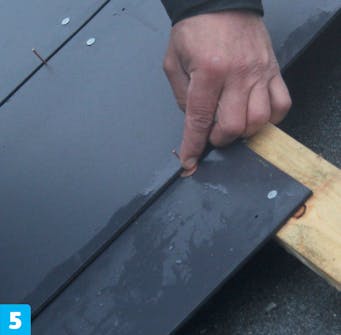 Stormsäkring: Nederst på varje platta finns det ett litet hål. Det ska sitta en kopparspik (en stormsäkring) som förs in mellan skifferplattorna nedanför och bockas in över plattan med en hammare.
