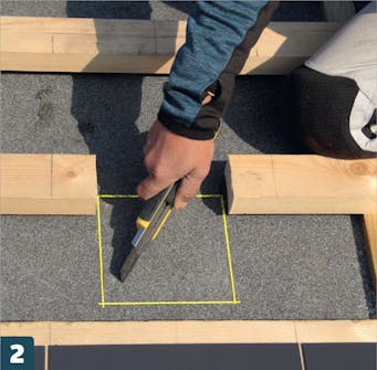 Vi sågar av läkten så att den saknar 5-10 mm för att nå in till takhuvens rör. Därefter markerar vi på undertaket och skär upp takpappen med ett kryss med en kraftig hobbykniv.