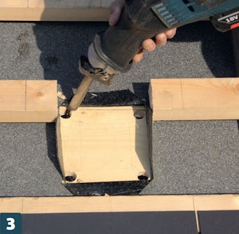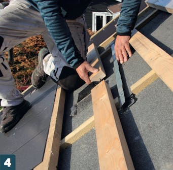 Ett par långa reglar sågas snett vid nock och takfot och spikas fast. Alla bärläkt skruvas fast i de långa reglarna med 5,5 x 90-mm utomhusskruv. Förborra så att läkten inte spricker.