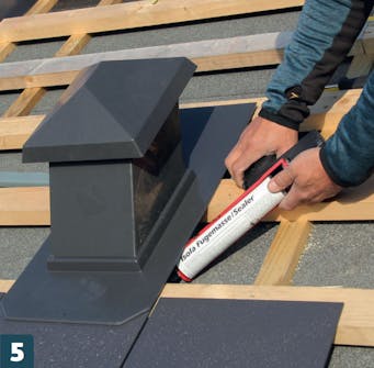 Principen liknar till förväxling den vi följde vid takfönsterna: Läkten sågas av, takpappen skärs upp, och vi lägger en ränna över huven så att vattnet kan rinna utanför. Därefter limmat vi ihop det hela så att det blir vattentätt.