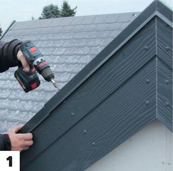 Takfotsplåten skruvas fast ovanpå vindskivorna. Plåtarna har samma gråa färg som de andra plåtarna och skyddar träet mot väder och vind.