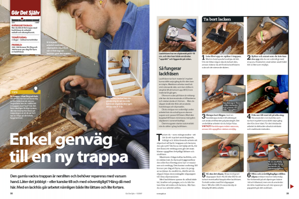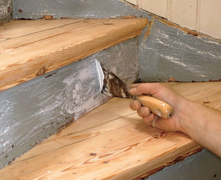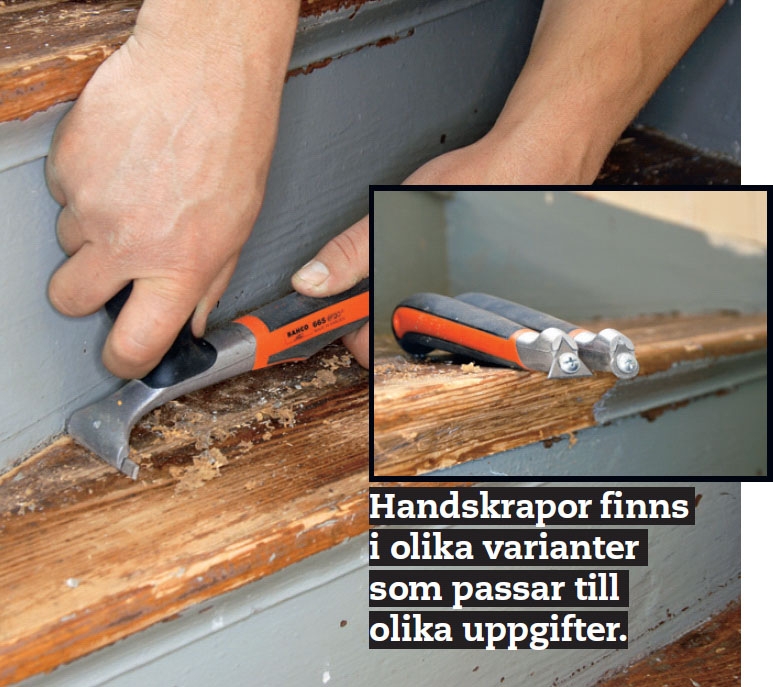 Leta först upp ev. spikar i trappan. Med en bred spackel avslöjas de lätt. Om du hittar någon ska du ta bort den, annars riskerar du att förstöra lackfräsens sula och de roterande skären.