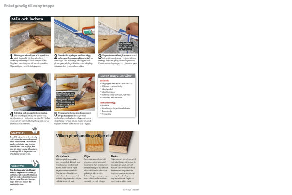 Sättsteg och vangstycken målas. Var försiktig så att du inte spiller färg på planstegen - täck dem eventuellt. Här har vi använt en halvmatt alkydfärg, som torkar snabbt och är slitstark.
