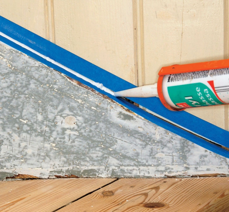 Om det är springor mellan vägg och vang (trappans sidostycke) ska man foga. Fäst målartejp på väggen och på vangen och foga därefter med akrylfogmassa av den typ som kan målas.