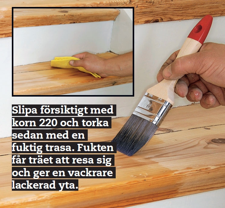 Sättstegen ska slipas och spacklas så att färgen får ett bra och plant underlag att fästa på. Först skrapas all lös färg bort, varefter ytan slipas och spacklas. Slipa slutligen med fint slippapper.