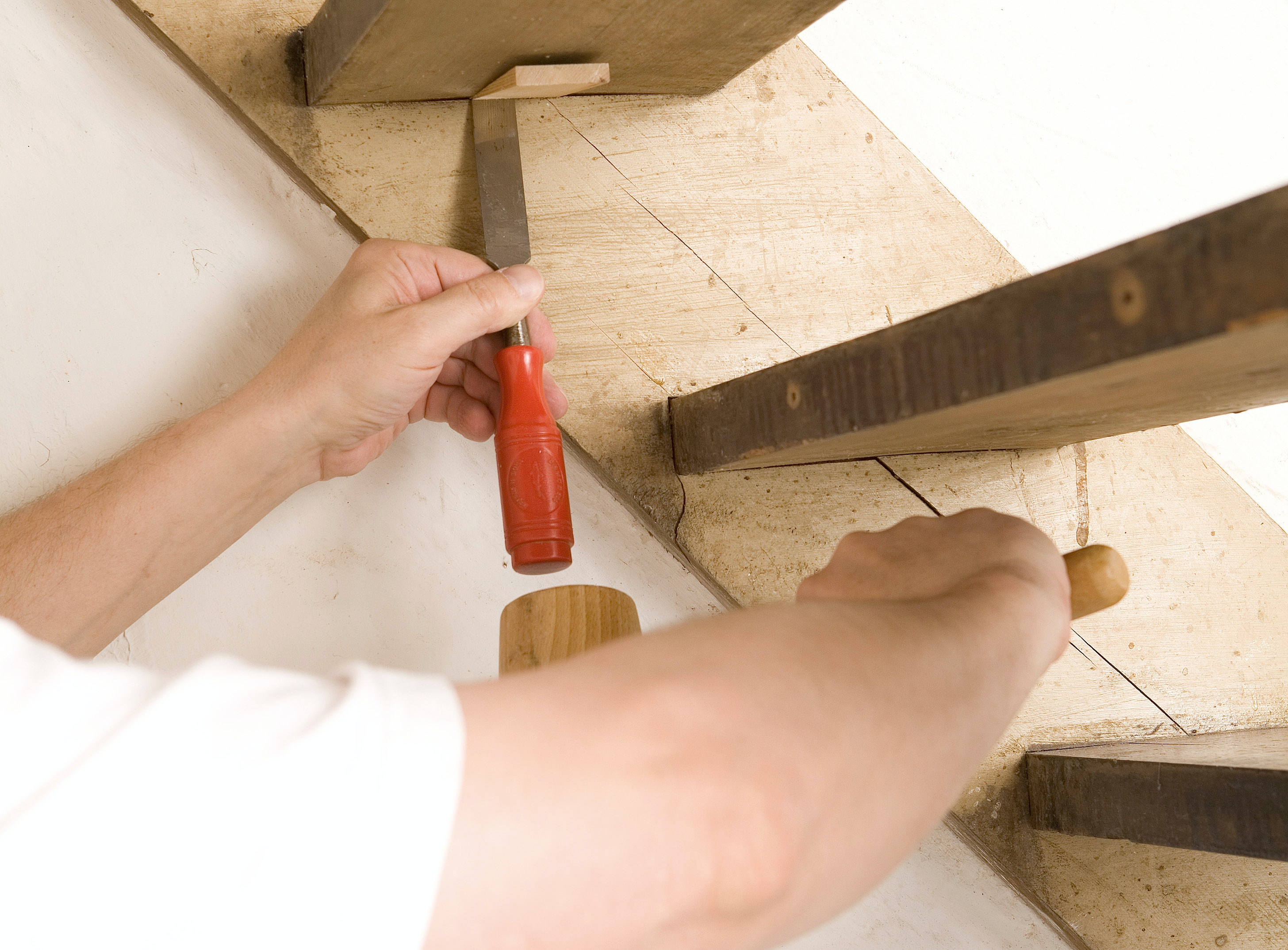 Nej, det är inte säkert att det hjälper, så vi föreslår en annan lösning. Ljuden från en knarrande trappa kommer från tappfogarna i vangstyckena, där planstegen sitter fast. På vintern är luftfuktigheten låg och träet krymper en aning, och då kan tappen röra sig i fogen. Resultatet är att det knarrar. Eftersom du kan komma åt trappan från undersidan bör du såga till några kilar, cirka 30 mm breda och mycket tunna i ena änden. Lägg på lite lim längst ut på varje kil och knacka in två eller tre kilar under varje steg och in i vangstycket. Hugg sedan av kilarna längs vangstycket med ett vasst stämjärn.