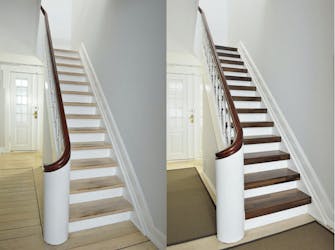 Mät trappavsatsen. Den är sannolikt så stor att den inte kan täckas av en enda skiva. Med hjälp av papp går det att skapa en mall för hela avsatsen. Såga till skivorna.