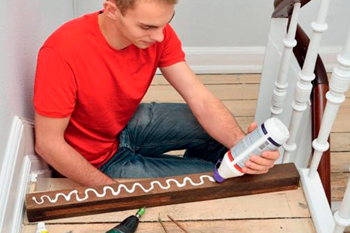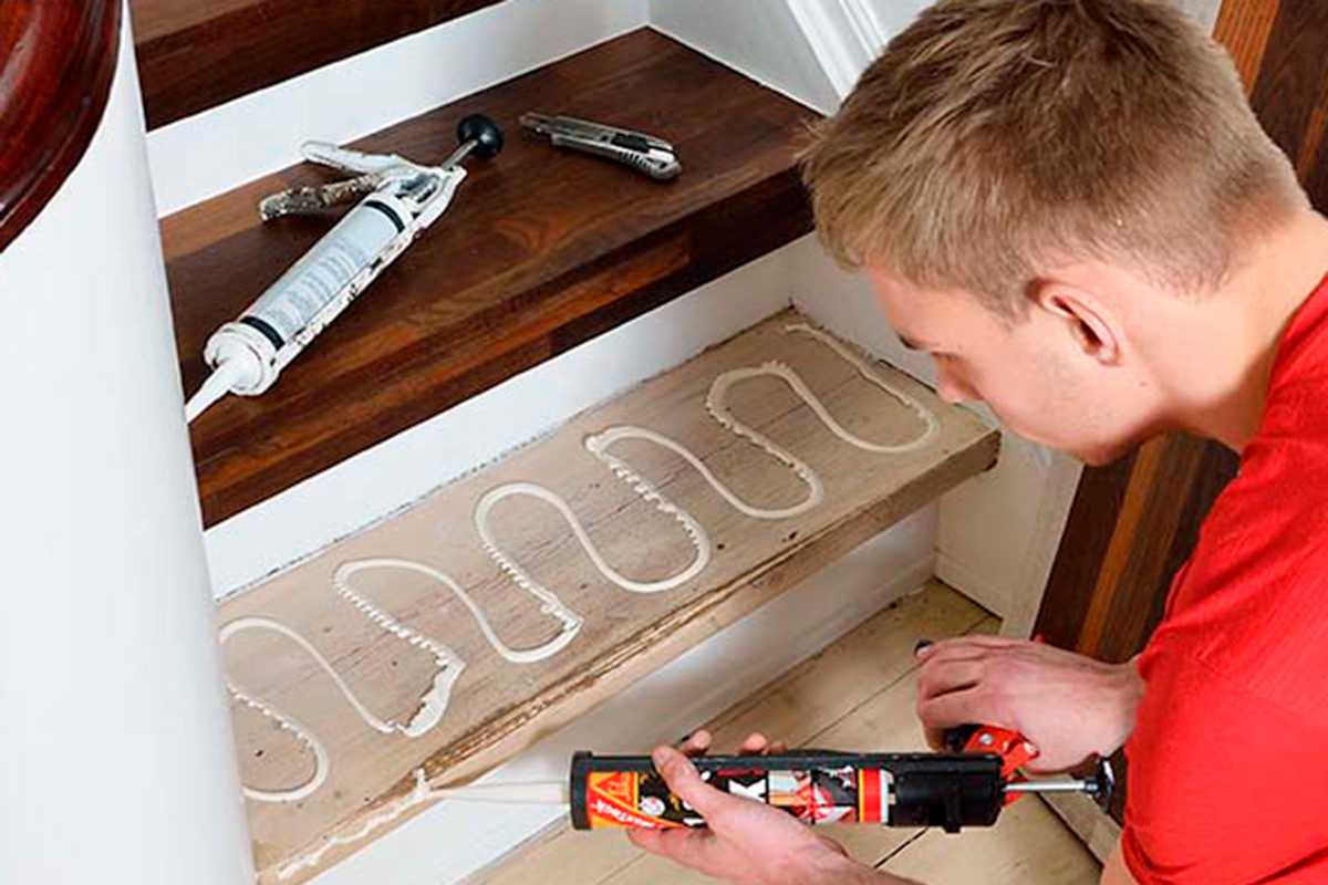 Limma fast stegen. Lägg flera strängar monteringslim på det gamla steget och dess framkant, lägg steget på plats och pressa ner det.