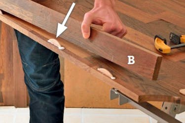 Klicka lim i spåren och tryck fast kexen under steget och tryck sedan fast framkanten B. Limmet får kexen att svälla och det ger en mycket stark fog.