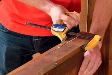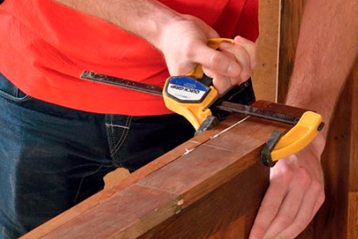 Spänn ihop de två delarna med tvingar. Det lim som pressas ut torkas bort med fuktig trasa. Låt fogen härda.