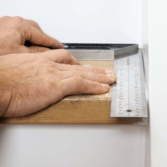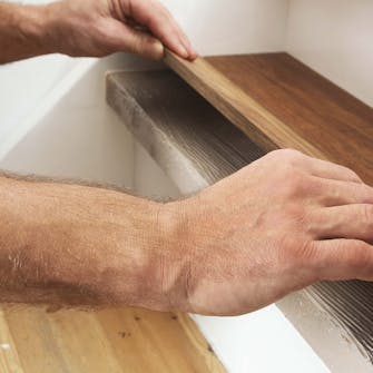 Tryck framkanten på plats när du har strukit trälim på den geringssågade kanten. Det är en fördel att palla upp framkanten med ett par reglar och någon kil när den trycks fast. Då är du säker på att den kommer på rätt nivå.