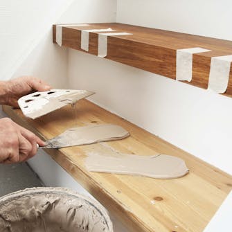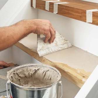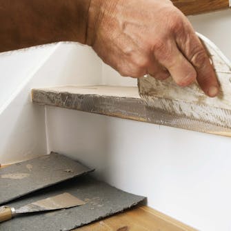 Lägg parkettlim på ett steg i sänder. Först lägger du på ett par klickar med spackel och därefter drar du ut limmet över hela trappsteget med 2 mm tandspackel. Det kan vara klokt att skydda sättsteg och vangstycken med tejp.