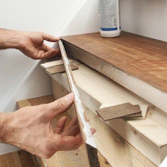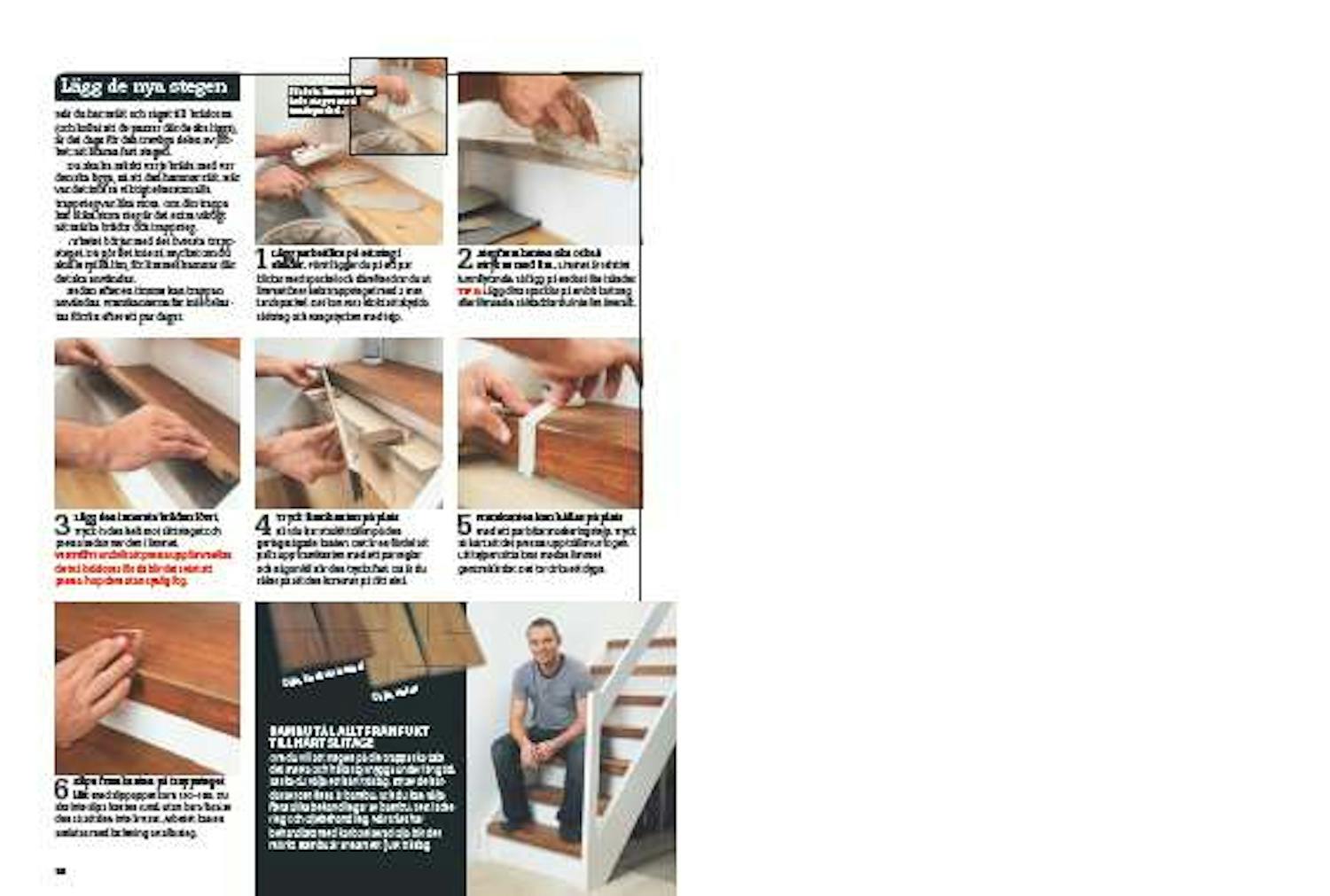Arbetet börjar med det översta trappsteget. Då gör det inte så mycket om du skulle spilla lim, för limmet hamnar där det ska användas.