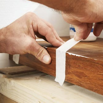 Framkanten kan hållas på plats med ett par bitar maskeringstejp. Tryck så hårt att det pressas upp trälim ur fogen. Låt tejpen sitta kvar medan limmet genomhärdar. Det tar cirka ett dygn.