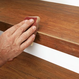 Slipa framkanten på trappsteget lätt med slippapper korn 150–180. Du ska inte slipa kanten rund, utan bara fasa av den så att den inte är vass. Arbetet kan ev. avslutas med lackering av alla steg.