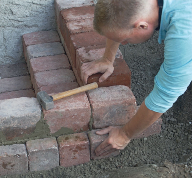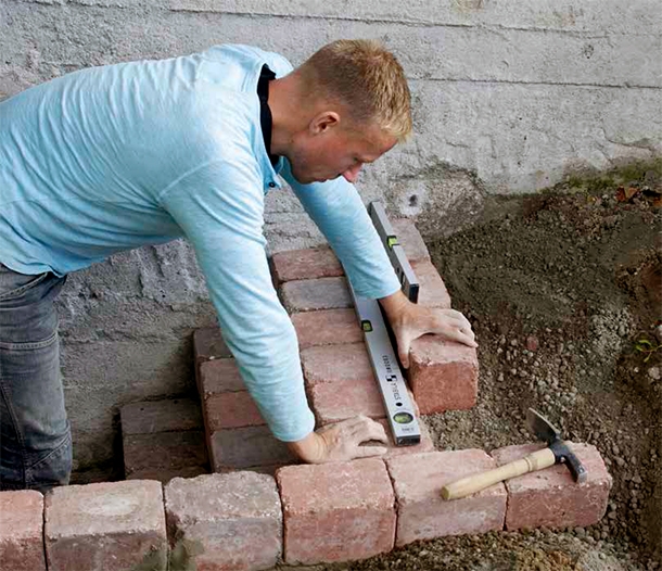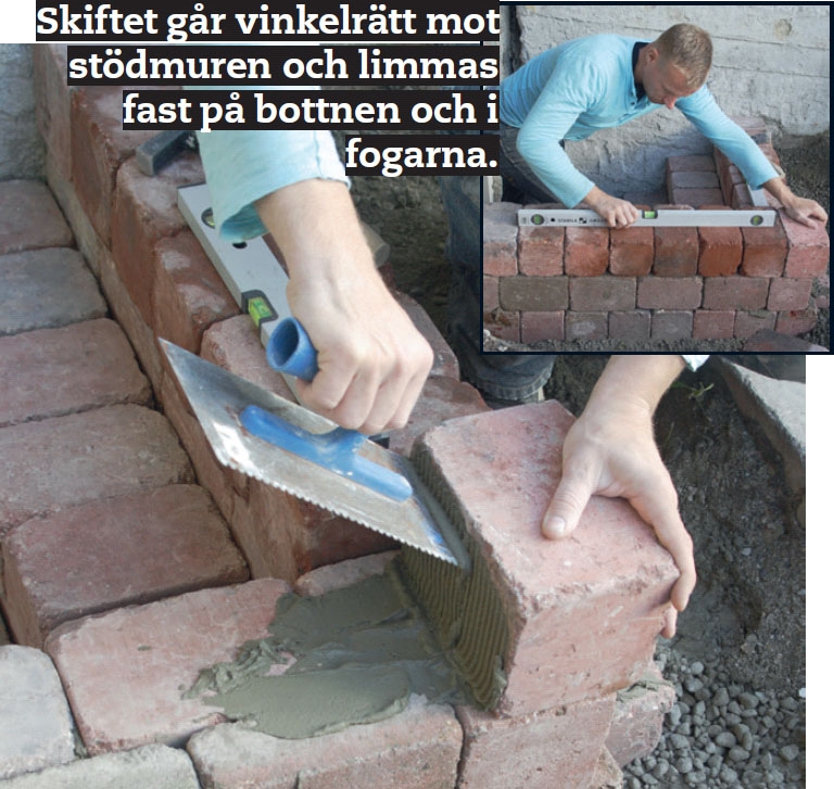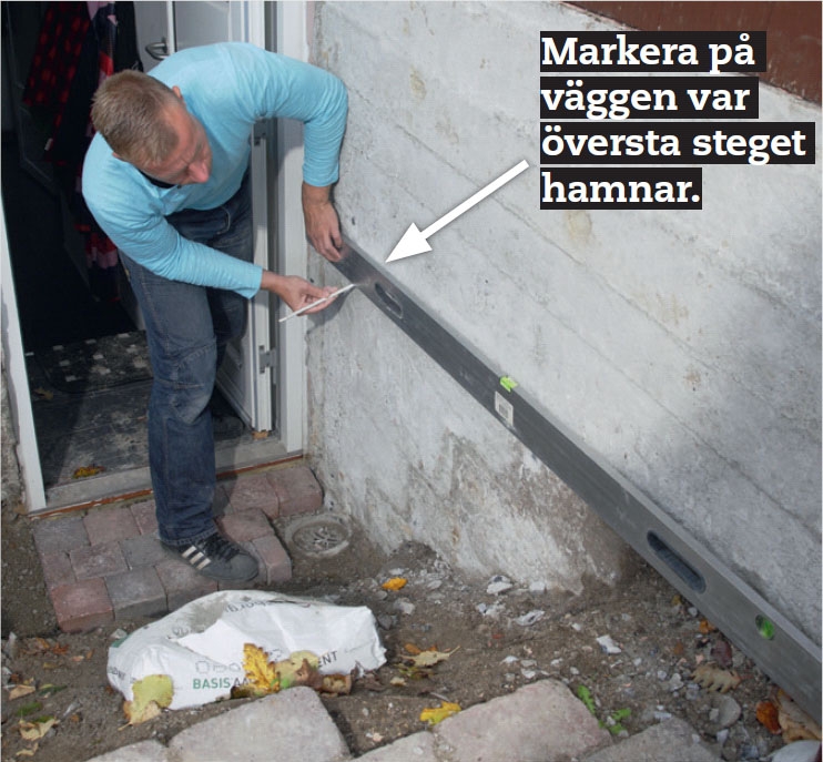 Torrbetongen pressas ihop ordentligt både under och bakom steget. Kolla med ett vattenpass att stenarna ligger vågrätt. De övre stenarna bör luta 2 mm framåt och neråt så att vatten kan rinna av.