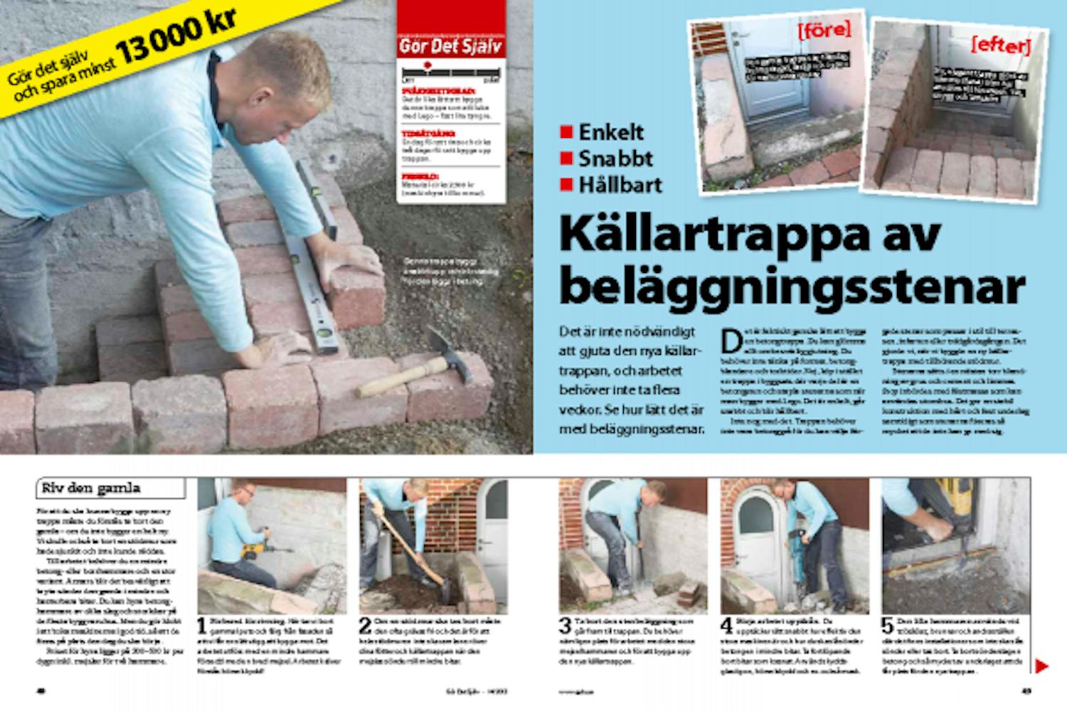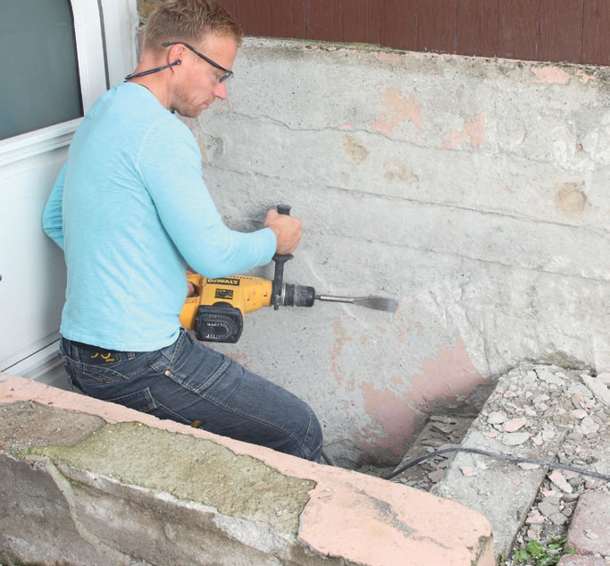Ta bort den stenbeläggning som går fram till trappan. Du behöver nämligen plats för arbetet med den stora mejselhammaren och för att bygga upp den nya källartrappan.