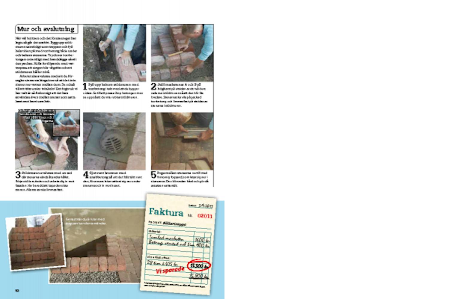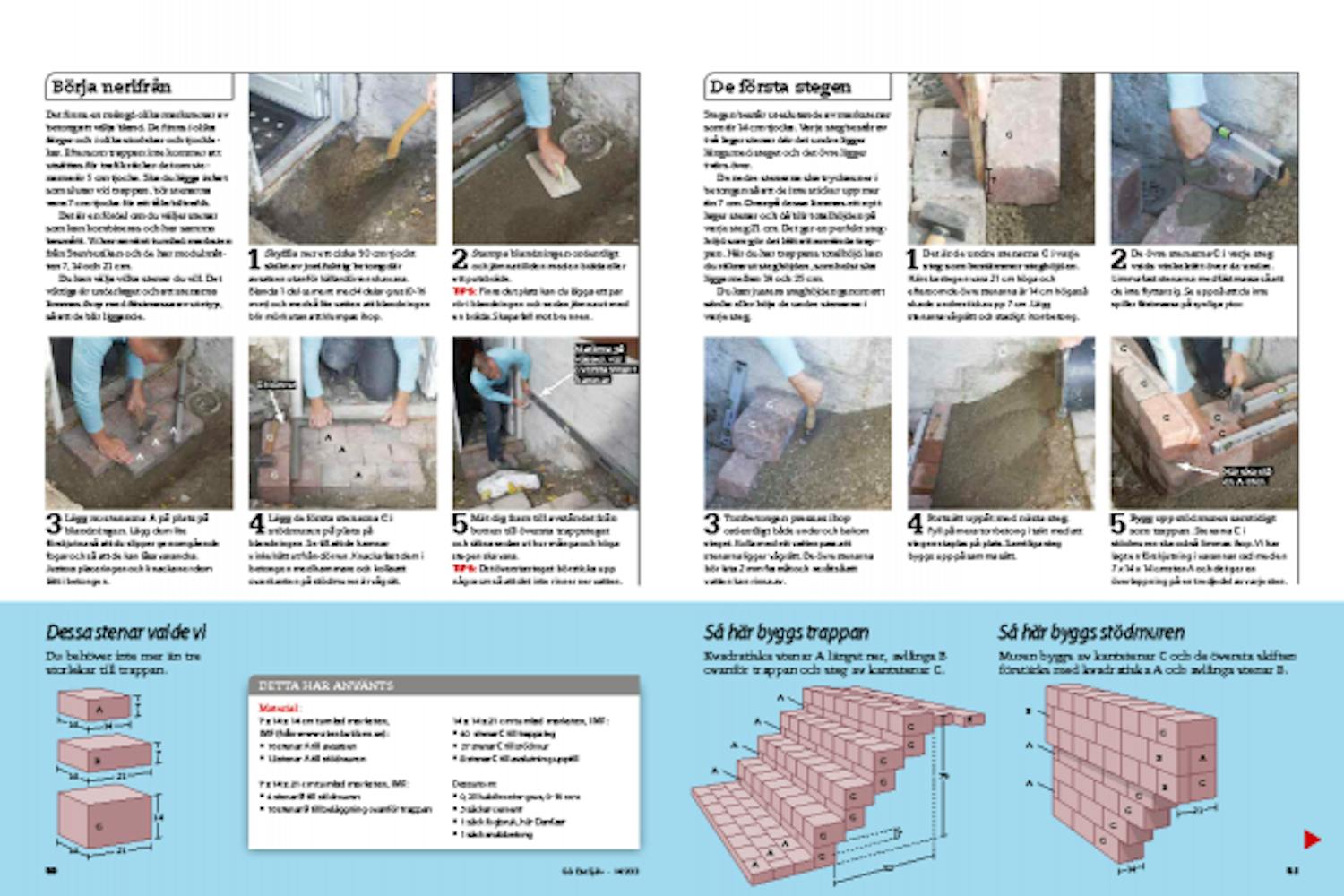 När väl bottnen och det första steget har lagts så går det snabbt. Bygg upp stödmuren samtidigt som trappan och fyll hela tiden på med torrbetong både under och bakom stenarna. Tryck ner torrbetongen ordentligt med handslägga så att den packas. Kolla fortlöpande med vattenpass att stegen blir vågräta och att stödmuren håller nivå.