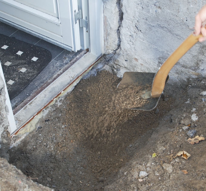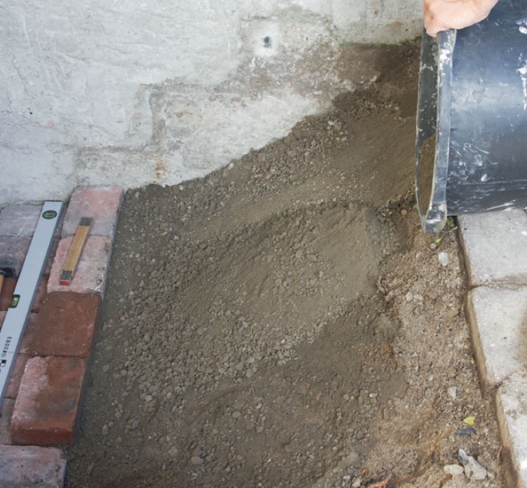 Skyffla ner ett cirka 10 cm tjockt skikt av jordfuktig betong där avsatsen utanför källardörren ska vara. Blanda 1 del cement med 4 delar grus (0-16 mm) och med så lite vatten att blandningen blir mörk utan att klumpas ihop.