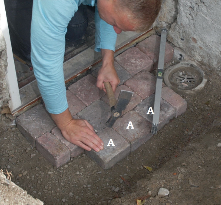 Lägg nu stenarna A på plats på blandningen. Lägg dem lite förskjutna så att du slipper genomgående fogar och så att de kan låsa varandra. Justera placeringen och knacka ner dem lätt i betongen.