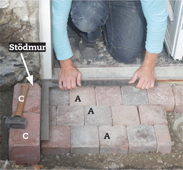 Ställ markstenar A och B på högkant på utsidan av de två övre raderna i stödmuren så att den blir lite bredare. Stenarna ska vila på packad torrbetong och limmas fast på utsidan av stenarna i stödmuren.