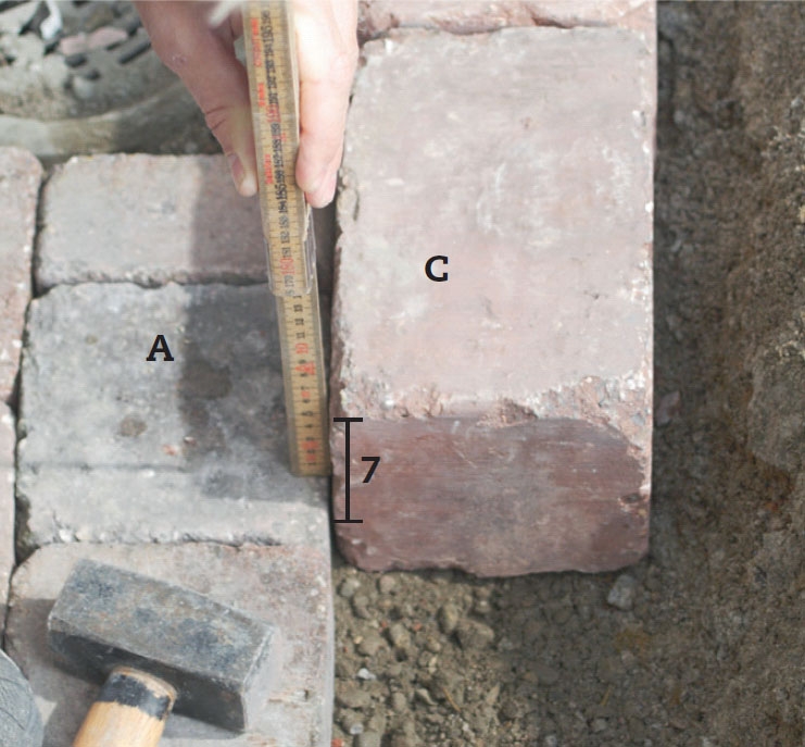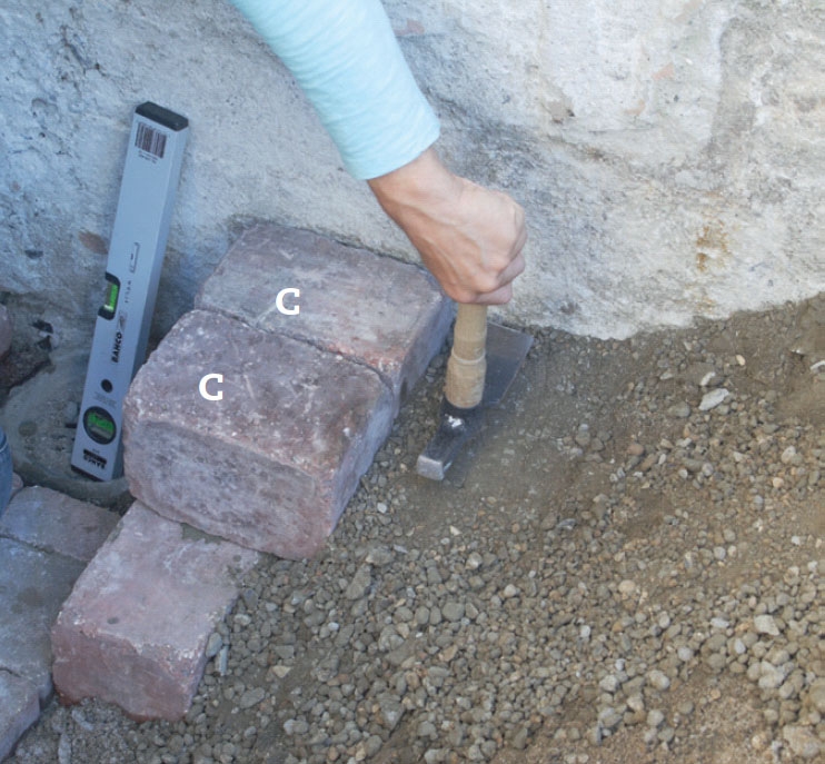 Det är de undre stenarna C i varje steg som bestämmer steghöjden. Här ska stegen vara 21 cm höga och eftersom de övre stenarna är 14 cm höga så ska de undre sticka upp 7 cm. Lägg stenarna vågrätt och stadigt i torrbetong.