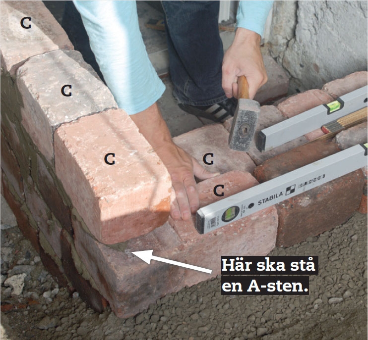 Lägg de första stenarna C i stödmuren på plats på blandningen. Se till att de hamnar vinkelrätt ut från dörren. Knacka fast dem i betongen med hammare och kolla att ovankanten på stödmuren är vågrät.