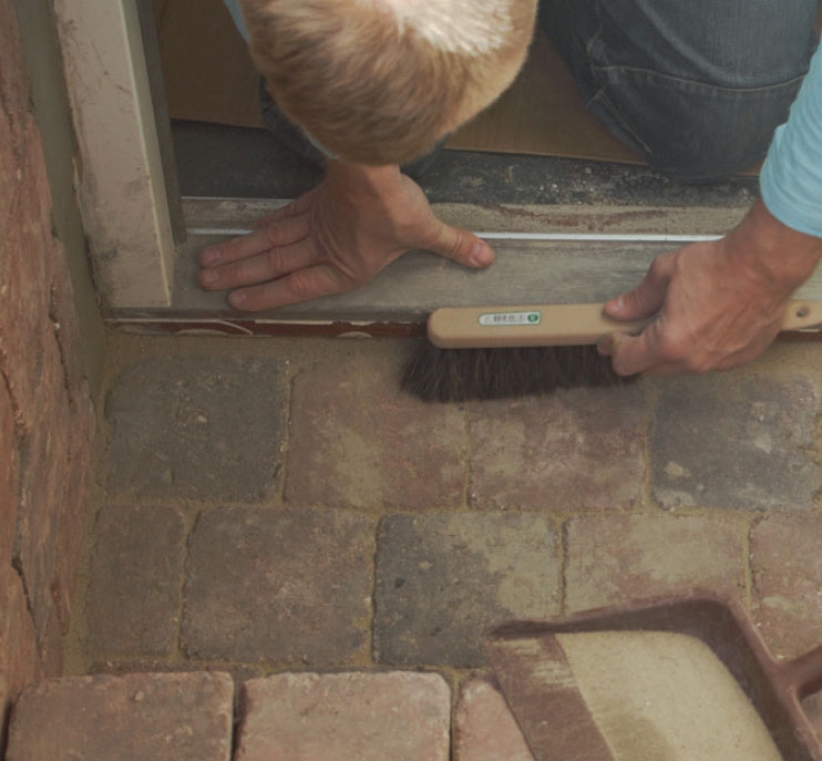 Arbetet ska avslutas med att du förseglar stenarna längst ner så att det inte rinner ner vatten mellan dem. Se också till att täta under tröskeln! Det fogbruk vi har valt är så finkornigt att det kan användas även mellan stenar som satts kant mot kant som här.