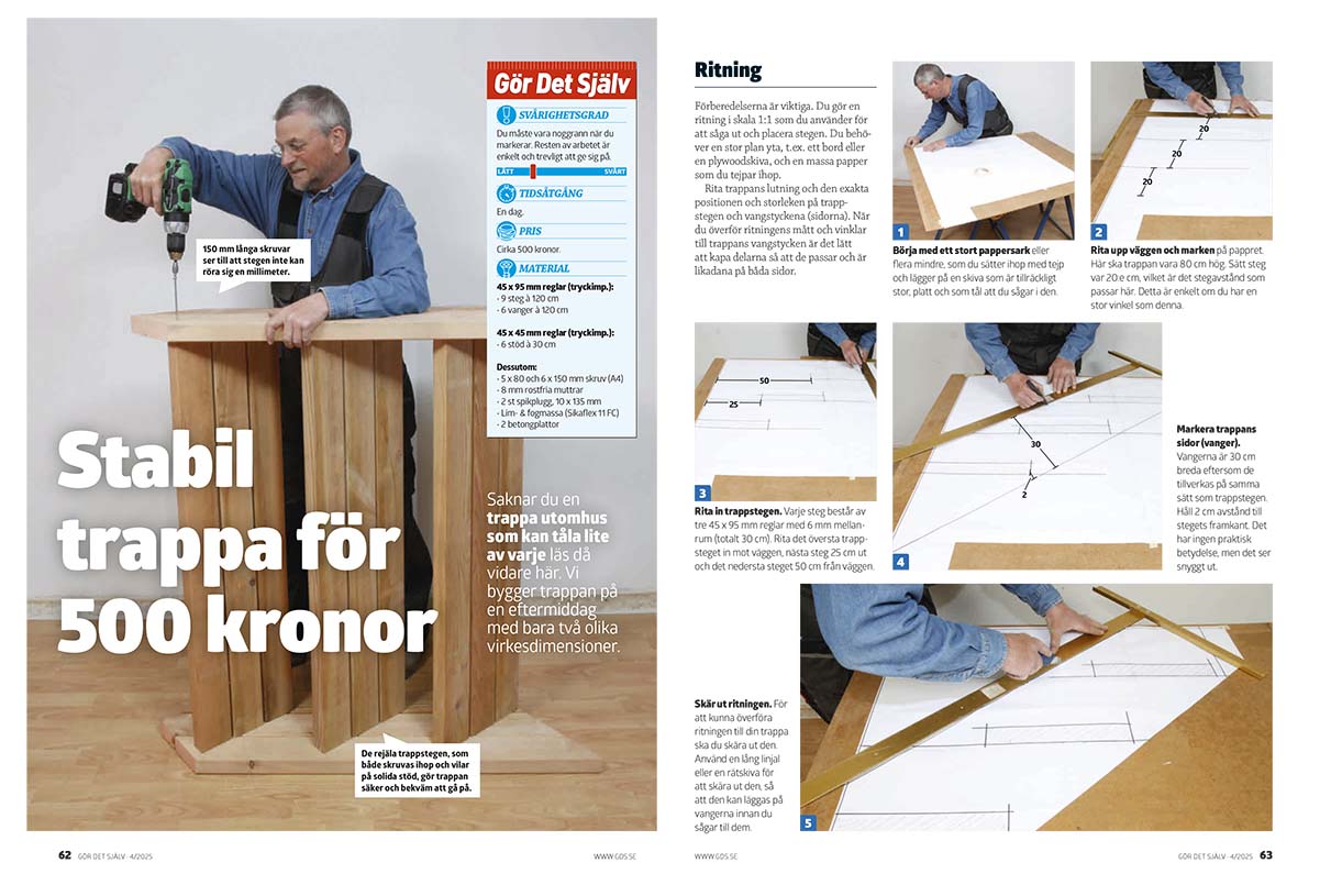 Förberedelserna är viktiga. Du gör en ritning i skala 1:1 som du använder för att såga ut och placera stegen.