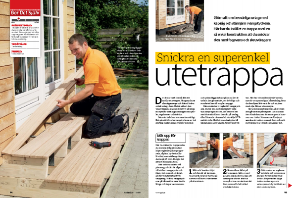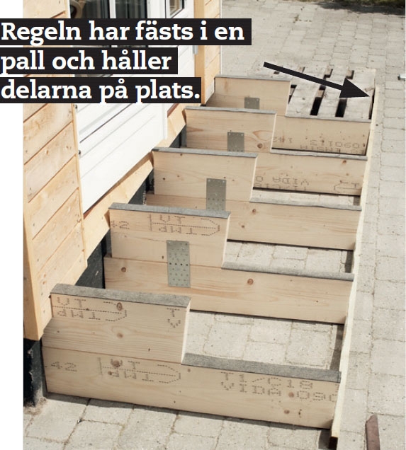 Trappan är ett bra projekt för de som inte har så stor erfarenhet. Var noga med att räta upp trappan i förhållande till fallet på terrassen för annars blir den ostadig.