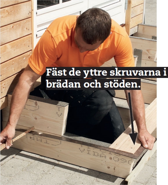 Skruva fast en regel nertill på framsidan av både stöden och vangstyckena. Då står de stadigt och flytter sig inte när du skruvar fast terrassbrädorna.
