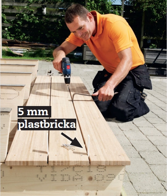 Fortsätt med resten av terrassbrädorna. Justera stöden om det är nödvändigt och dra i alla skruvar. Se till att hålla 5 mm avstånd mellan brädorna. Använd gärna avståndsbrickor till detta.