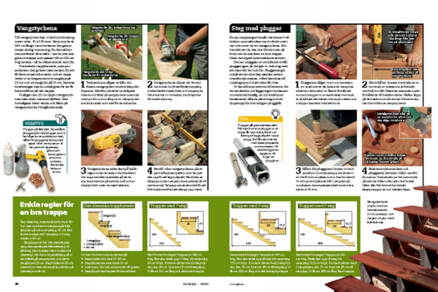 De sju trappstegen består vardera av två brädor, som sätts fast med två skruvar i var och en av de tre vangstyckena. Det innebär att du ska dra i 84 skruvar, så även om du snickrar en kort trappa, lönar det sig att systematisera arbetet.