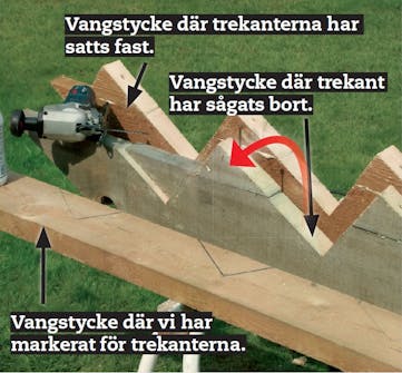 Trekanterna sågas ut från det första vangstycket med sticksåg eller fogsvans. Därefter vänds de bortsågade bitarna och fästs på vangstyckets ovansida med pu-lim och en lång skruv. Vangstycket används sedan som mall för de två andra.
