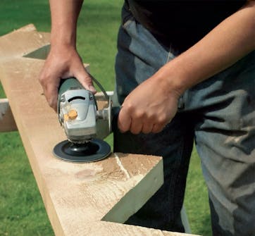 Vangstyckena slipas när limmet har torkat. Se till att få slät övergång mellan fastlimmade bitar och vangstycke. Här använder vi vinkelslip med slipskiva för snabb slipning.