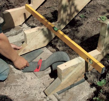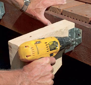 Vangstyckena sätts fast på bjälklaget under terrassen med balkskor. Var noga med att ovansidan på de tre styckena hamnar på samma nivå och en stegtjocklek under terrassbrädorna.