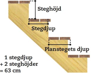 Den klassiska, matematiska formeln för hur man snickrar en trappa utgår från längden på ett normalsteg, 63 cm. Och formeln säger att 1 stegdjup + 2 steg-höjder = 63 cm.