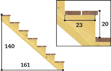 Stegdjupet är här inte planstegets djup utan avståndet från sättsteg till sättsteg (den lodräta biten mellan två plansteg). Här har vi inga sättsteg, så vi tar måttet på vangstycket, och där är stegdjupet 23 cm. Steghöjden är 20 cm, oavsett om man tar meds tjockleken på planstegen eller ej.
